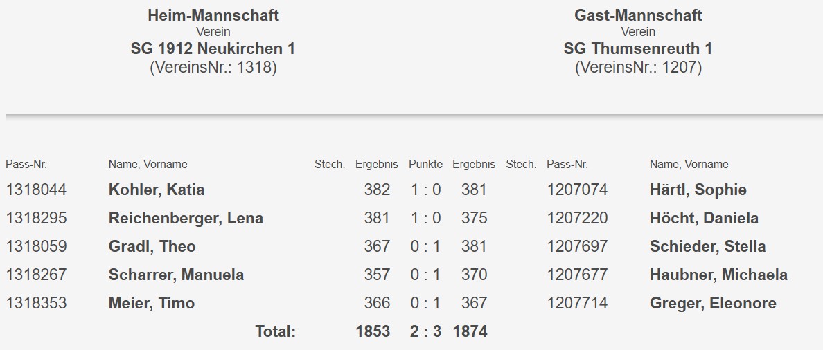 Am Sonntagnachmittag startete auch unsere Luftgewehrmannschaft in die neue Landesliga-Saison. Im ersten Wettkampf traf das Team auf Thumsenreuth. Trotz starker Einzelergebnisse unserer Schützinnen und Schützen reichte es am Ende leider nicht zum Sieg – die Begegnung endete 2:3.