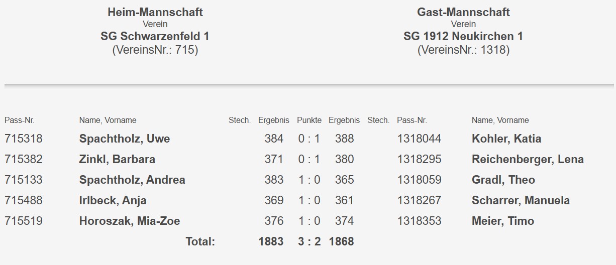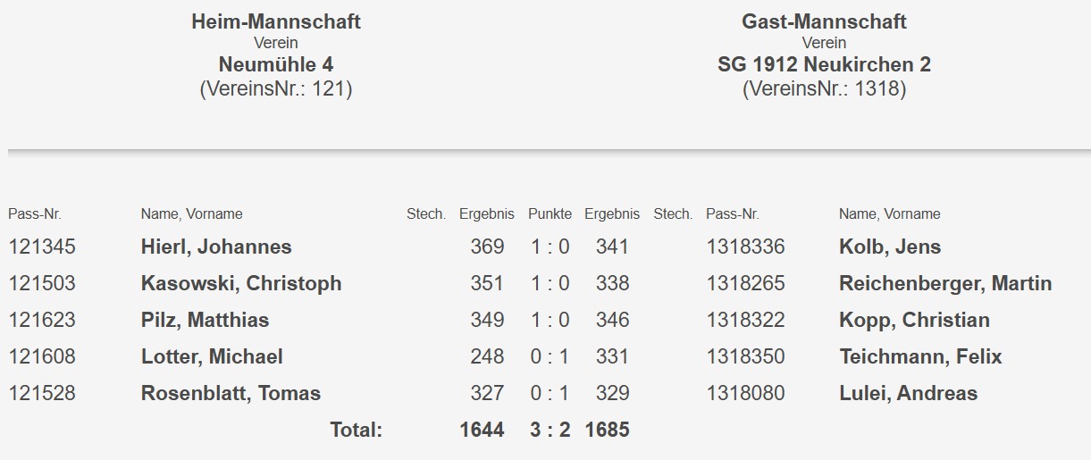 Im ersten Wettkampf gegen Neumühle zeigte das Team eine starke Leistung und erzielte 1685 Ringe. Trotz der höheren Gesamtringzahl mussten sich unsere Schützen jedoch knapp mit 2:3 Punkten geschlagen geben.