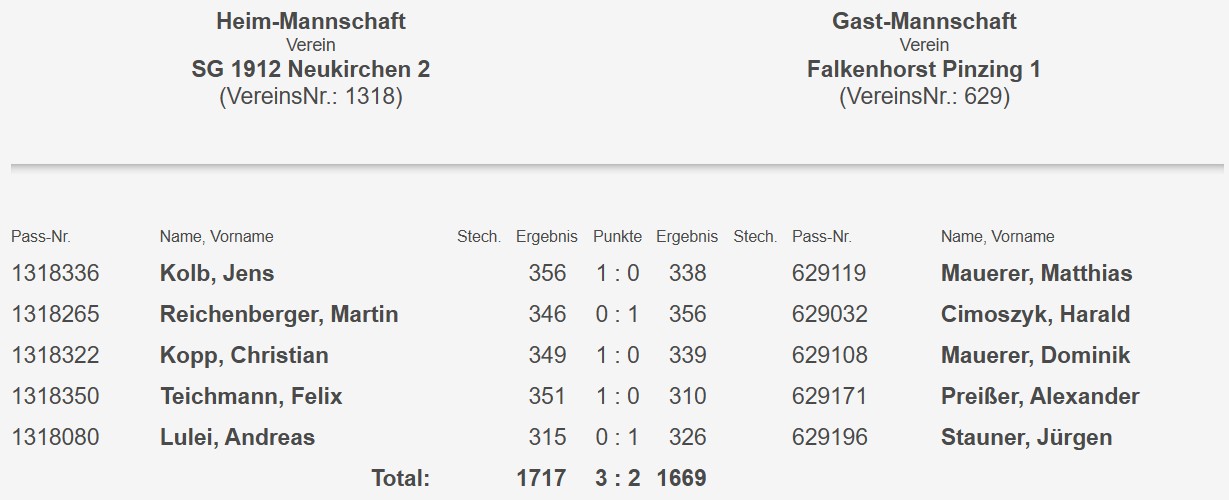 Im zweiten Rundenwettkampf traf die Mannschaft auf Falkenhorst Pinzing. Mit 1717 Ringen und einem 3:2-Sieg konnte der erste Erfolg der Saison eingefahren werden.